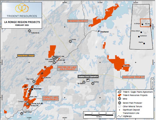 Vancouver, BC, February 26th, 2026 – Trident Resources Corp. (TSX-V: ROCK) (OTCQB: TRDTF) (“Trident” or the “Company” ) is pleased to announce that it has signed a mineral property purchase and sale agreement dated February 25th, 2026 (the “Agreement”) with Eagle Plains Resources Ltd.(“Eagle Plains” or the “Vendor”) pursuant to which the Company shall acquire up to 100% interest in 7 individual mineral dispositions that total approximately 4,711 hectares (ha) within the La Ronge Gold Belt in Northern Saskatchewan, Canada.