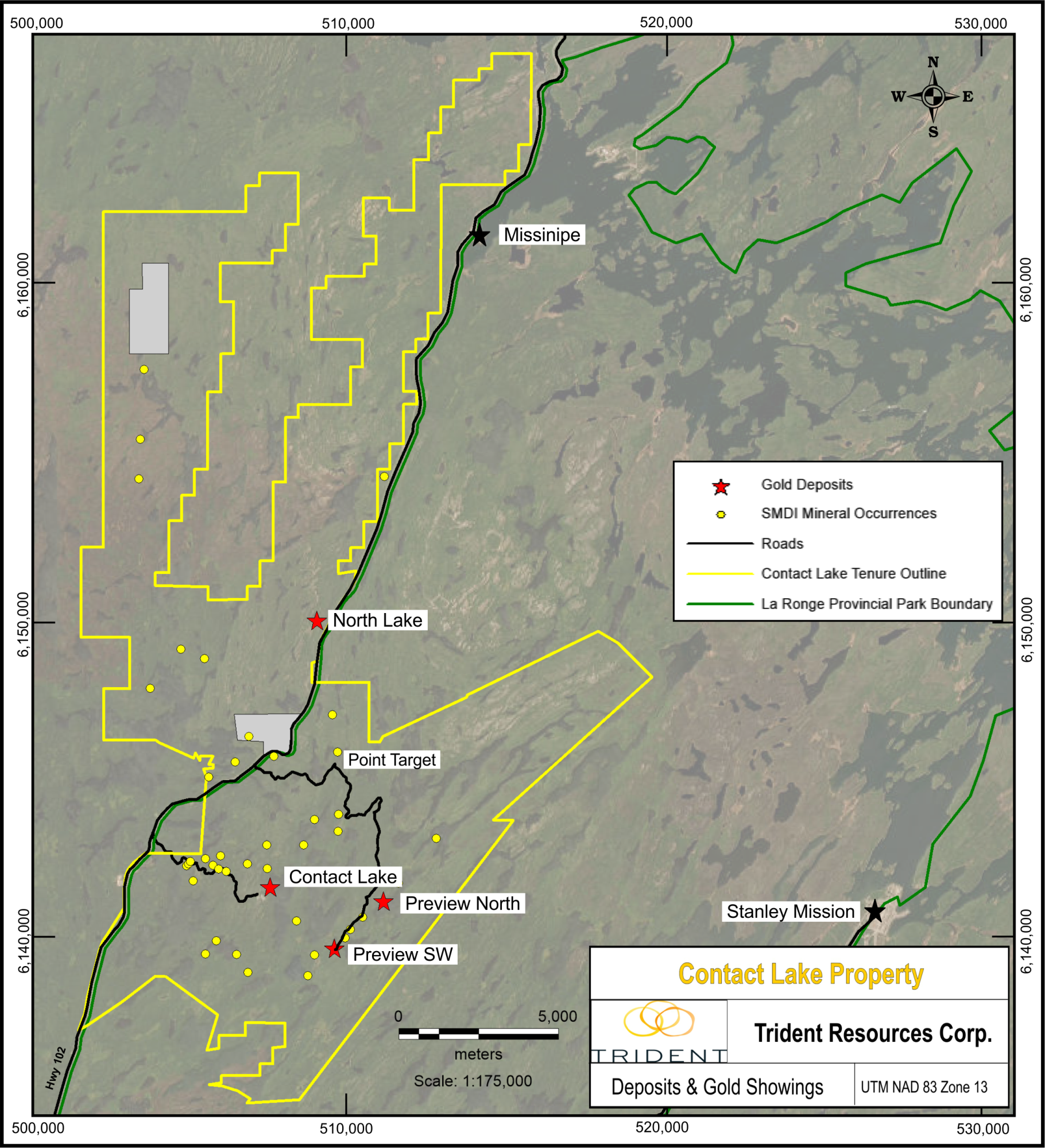 The Project hosts four key deposits—Contact Lake, Preview SW, Preview North, and North Lake— that serve as the base of Trident’s strategic vision to build upon a rich history of gold mineralization in the La Ronge Gold Belt. This approach is focused on consolidating and advancing highly prospective deposits in one of Saskatchewan’s most underexplored yet richly endowed gold districts. In addition to these deposits, the Contact Lake Gold Project hosts the Point Lake Target, an advanced prospect with significant exploration potential that the Company will look to aggressively advance. These targets not only underscore the property's geological prospectivity but also present strong potential for both the expansion of known deposits and the discovery of new ones, positioning the Contact Lake Gold Project as a foundational asset in Trident’s long-term strategy for growth, discovery, and value creation.