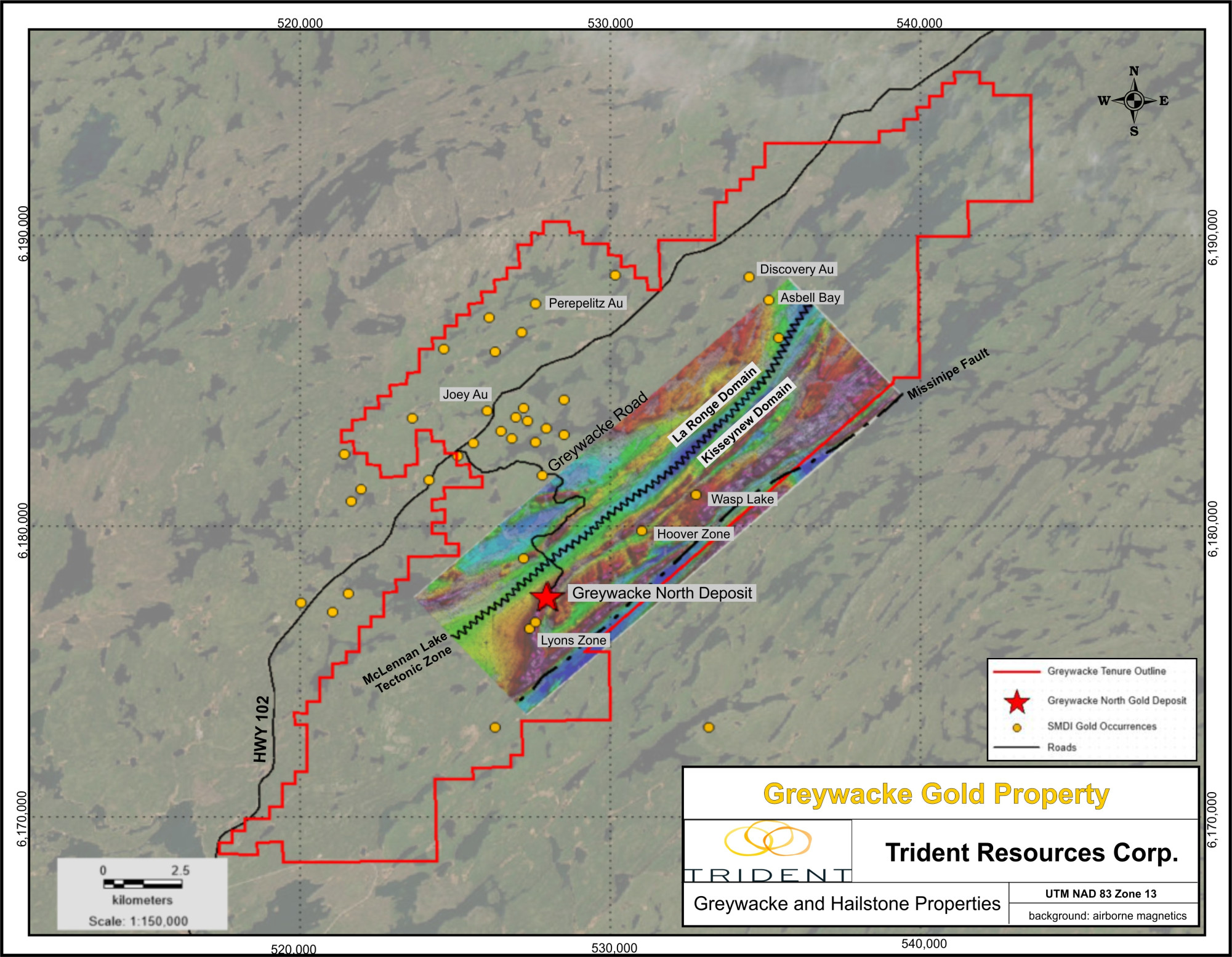 The 6,902 hectare Hailstone Property is comprised of 8 contiguous claims that are part of the Trident’s broader Greywacke Lake Gold Property. The Property is located in northern Saskatchewan, approximately 100 km northeast of La Ronge, and is road-accessible via Highway 102 that runs through the center of the Property to provide year-round access. Trident has also staked additional claims immediately adjacent to both Hailstone and Greywacke that host multiple base and precious metal showings.