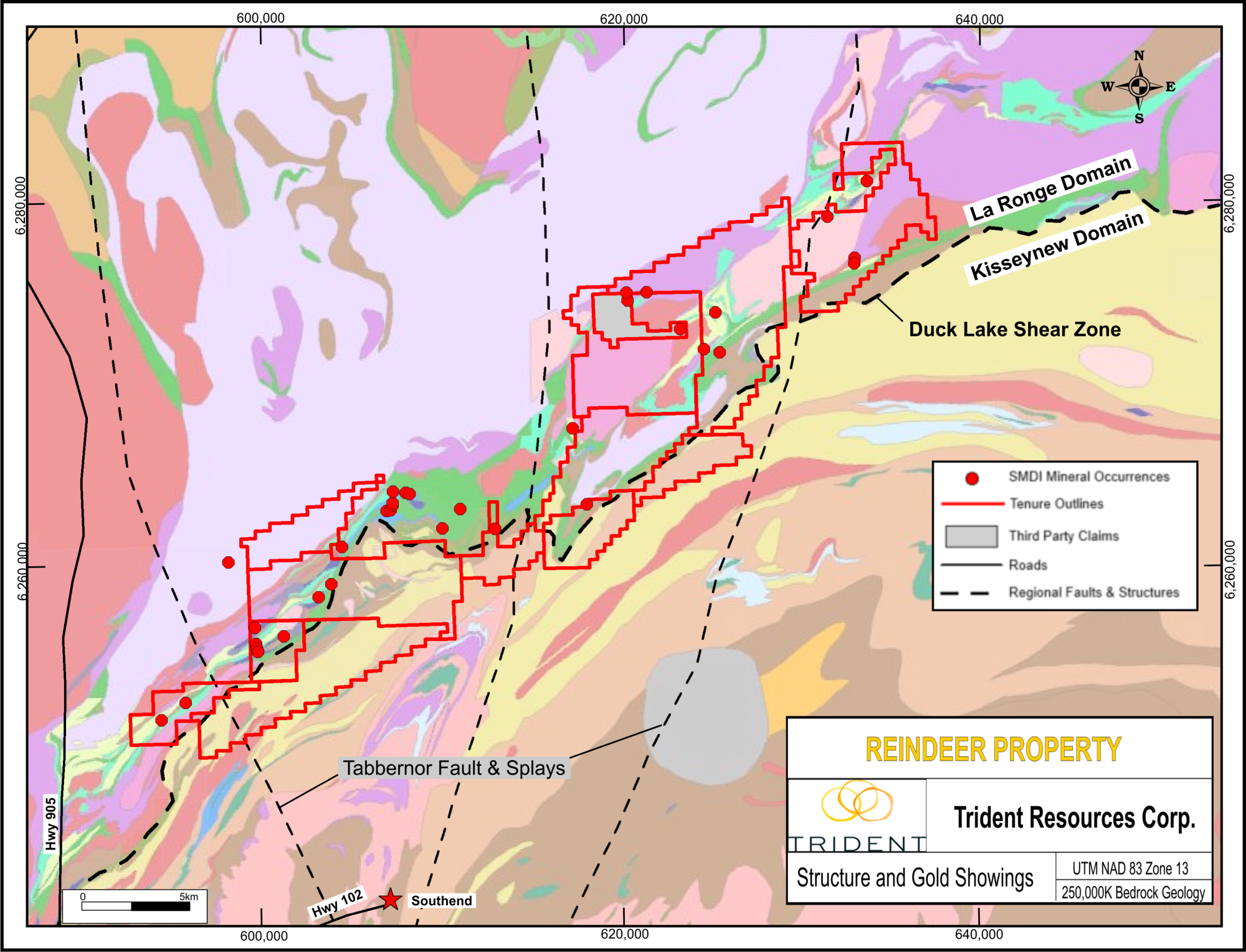 The Reindeer Project consists of 10 contiguous mineral claims totaling 27,930 hectares in northern Saskatchewan. The Property lies along the contact between the La Ronge and Kisseynew Domains of the Trans-Hudson Orogen, a prolific geological belt hosting multiple gold and base metals deposits. Importantly, the Property is cut by three strands of the Tabbernor Fault system, a major crustal structure that also hosts the Seabee Gold operations (with more than 2 million ounces of cumulative gold production).
